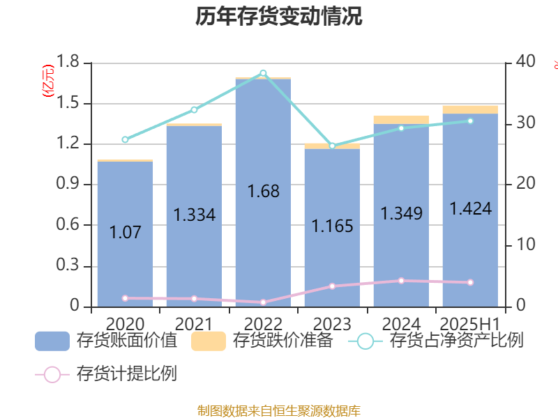 从存货变动来看,戒指2025年上半年末,公司存货账面价值为1.42亿元,占净钞票的30.44%,较上年末增多750.39万元。其中,存货跌价准备为587.37万元,计提比例为3.96%。