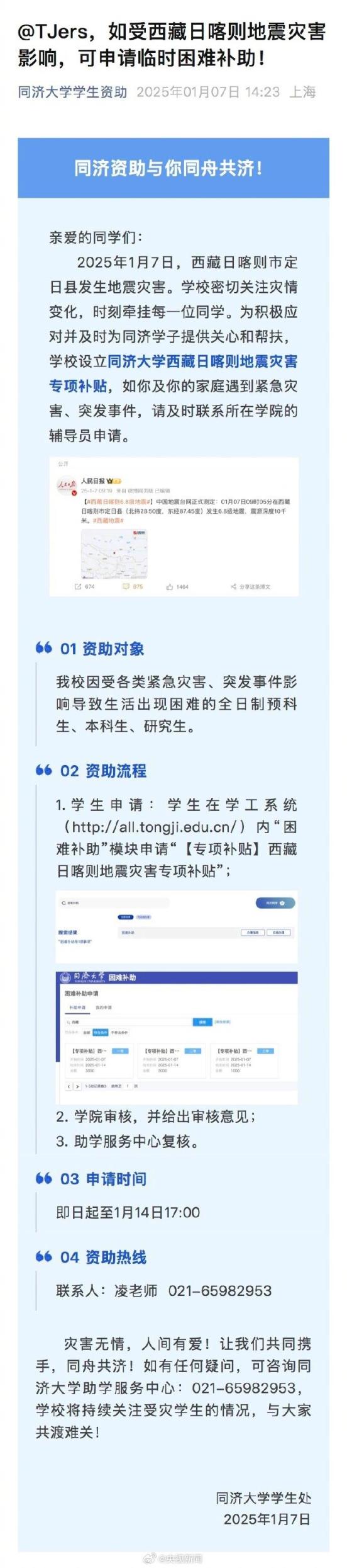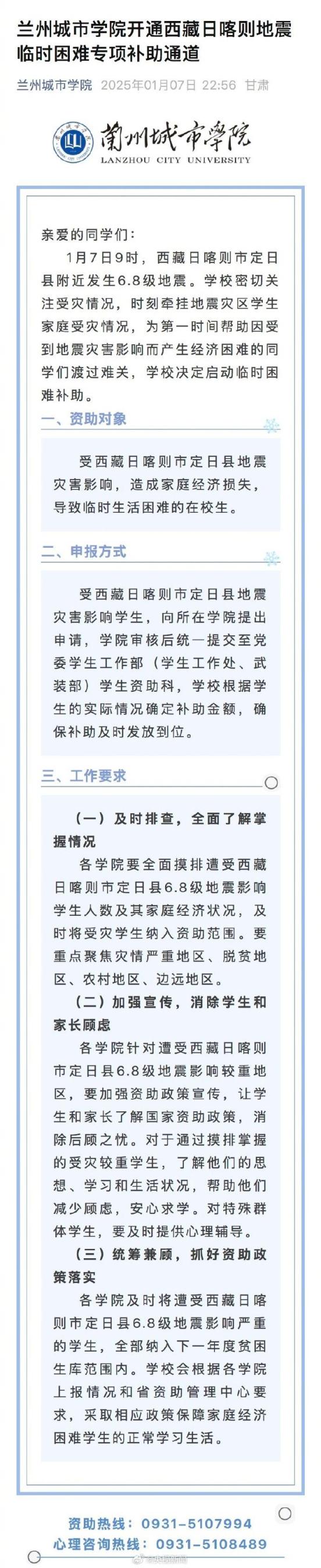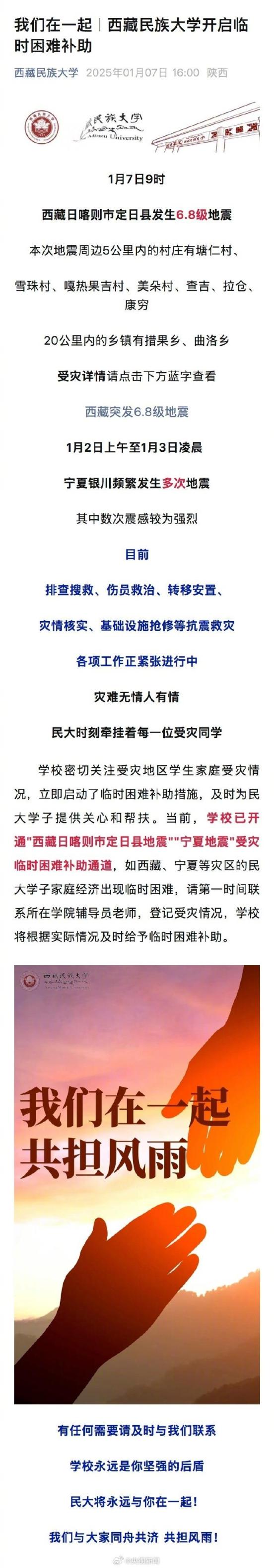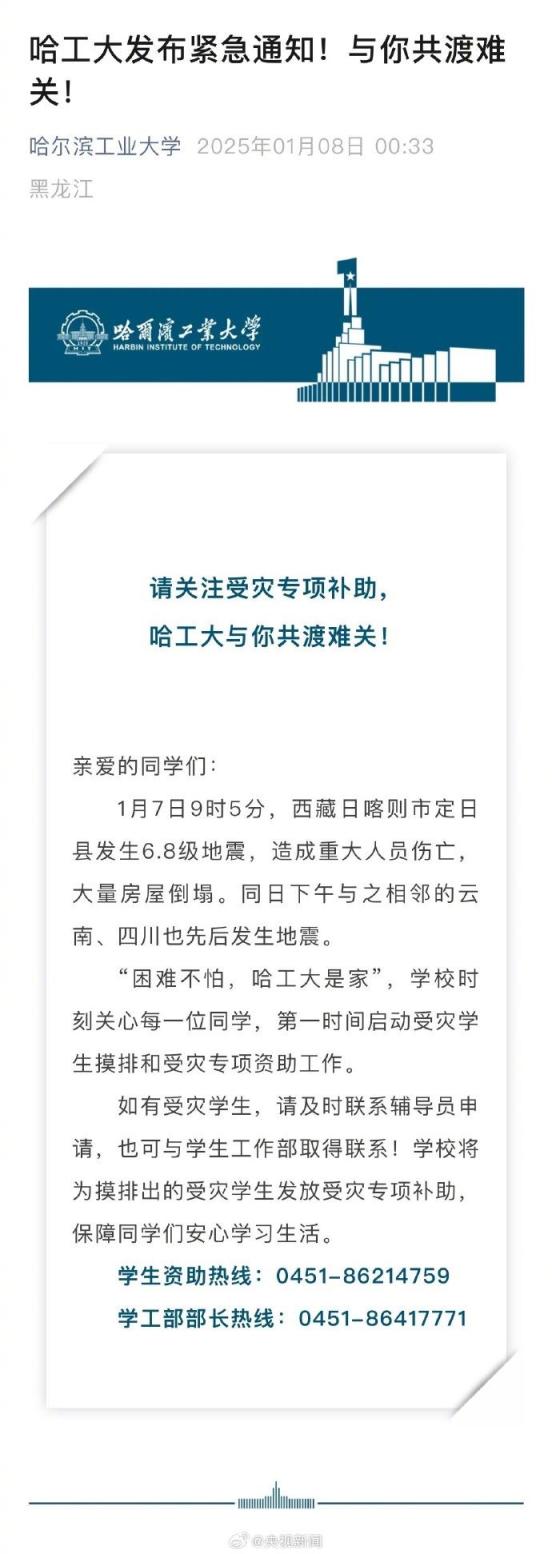 西藏日喀则市定日县发生6.8级地震后,哈尔滨工业大学、大连理工大学、兰州大学、西藏民族大学、重庆邮电大学、长春工程学院、同济大学、复旦大学、上海交通大学等多所高校,链接开展学生家庭受灾情况排查责任,开启临时贫苦援救通谈开yun体育网,帮学子度过难关。