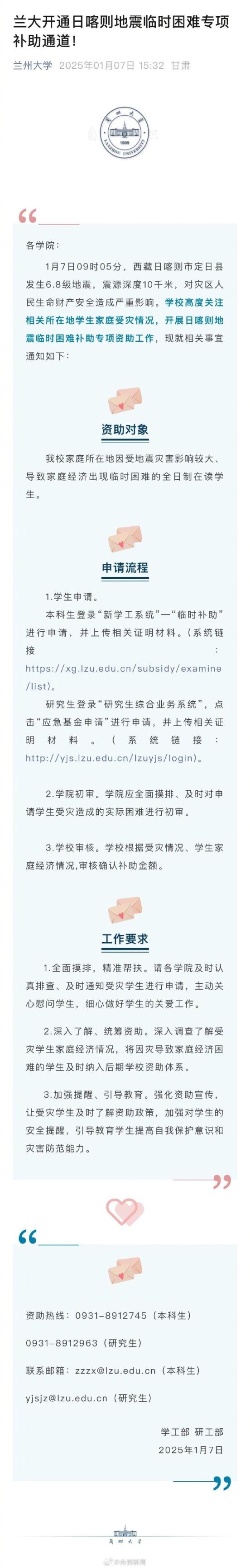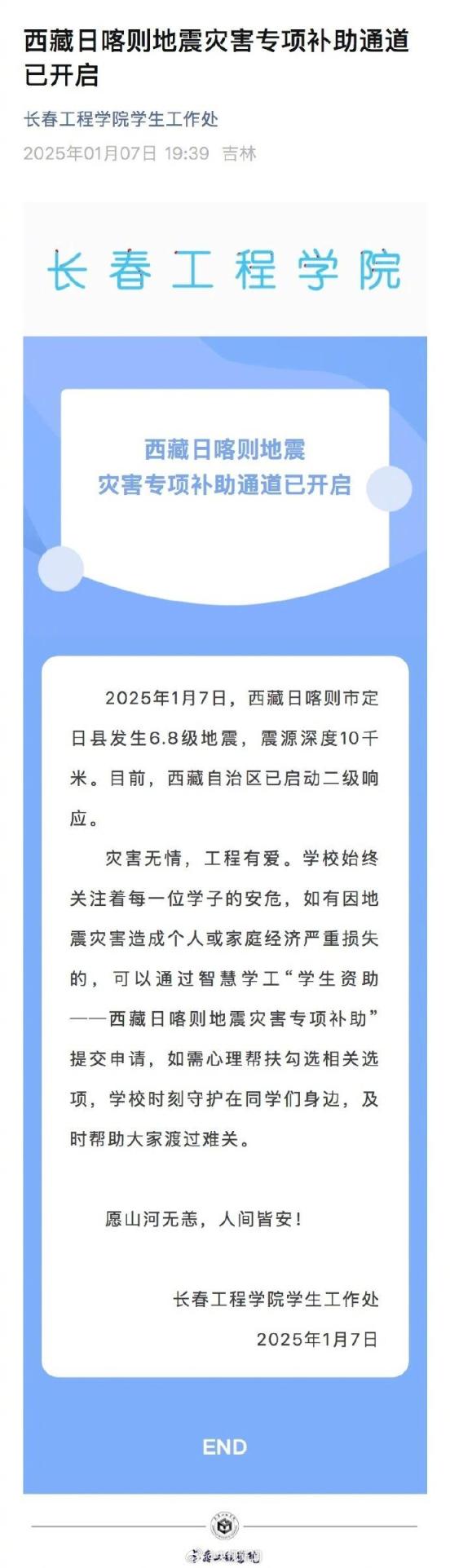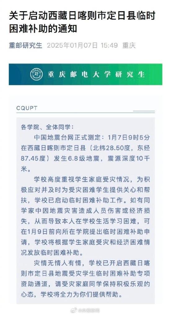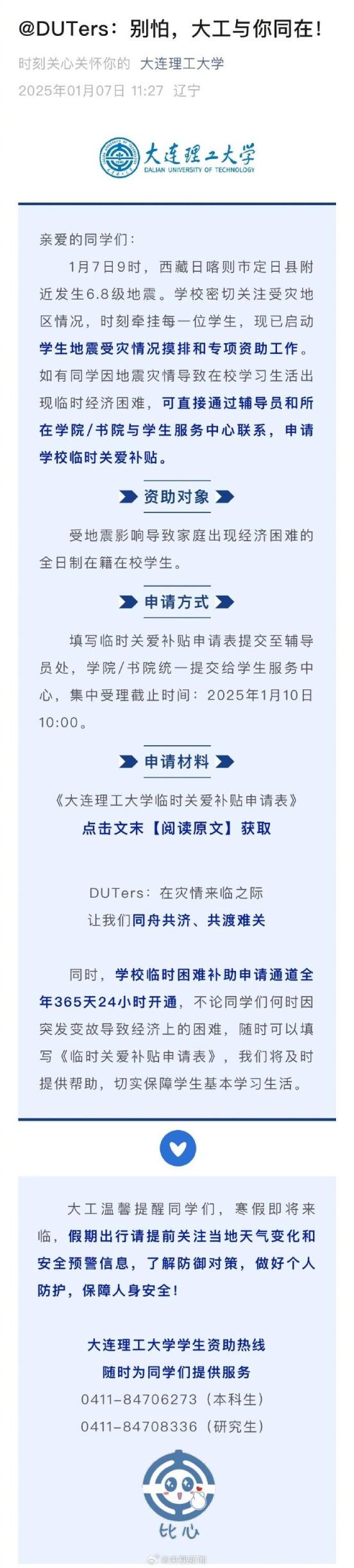西藏日喀则市定日县发生6.8级地震后,哈尔滨工业大学、大连理工大学、兰州大学、西藏民族大学、重庆邮电大学、长春工程学院、同济大学、复旦大学、上海交通大学等多所高校,链接开展学生家庭受灾情况排查责任,开启临时贫苦援救通谈开yun体育网,帮学子度过难关。